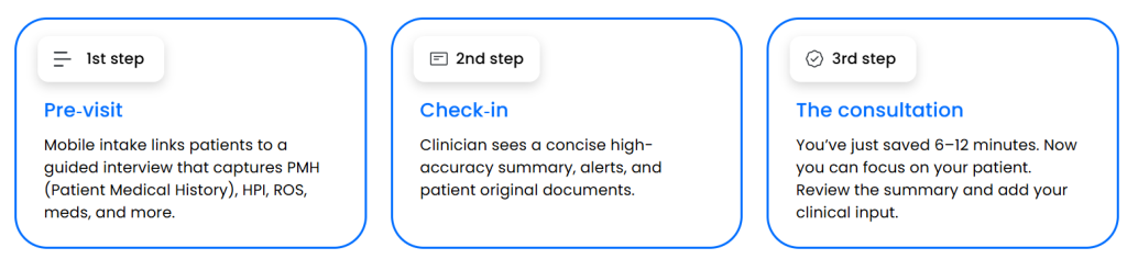 For patients, the system offers an intuitive and fully digital intake process. They receive a link, via scheduling workflows or a QR code at the clinic and complete the AI‑driven interview at their own pace, on their preferred device. They are prompted to upload medical documents, and the system checks that the information is clear and meets the clinic’s predefined requirements. At the end of the process, the AI provides a summary of key details for the patient’s review and approval. This structured approach aims to ensure that essential information is captured in advance and that the in‑person consultation starts from a more complete picture of the patient’s history and symptoms.